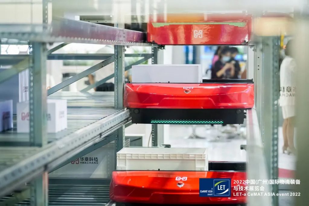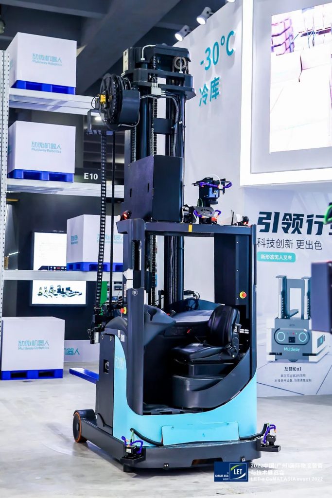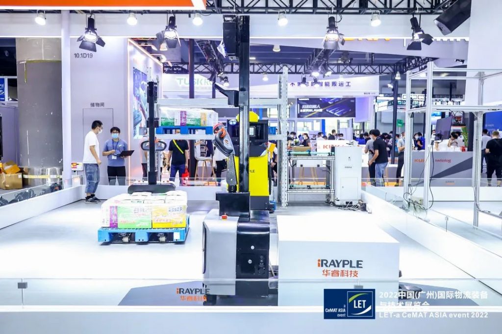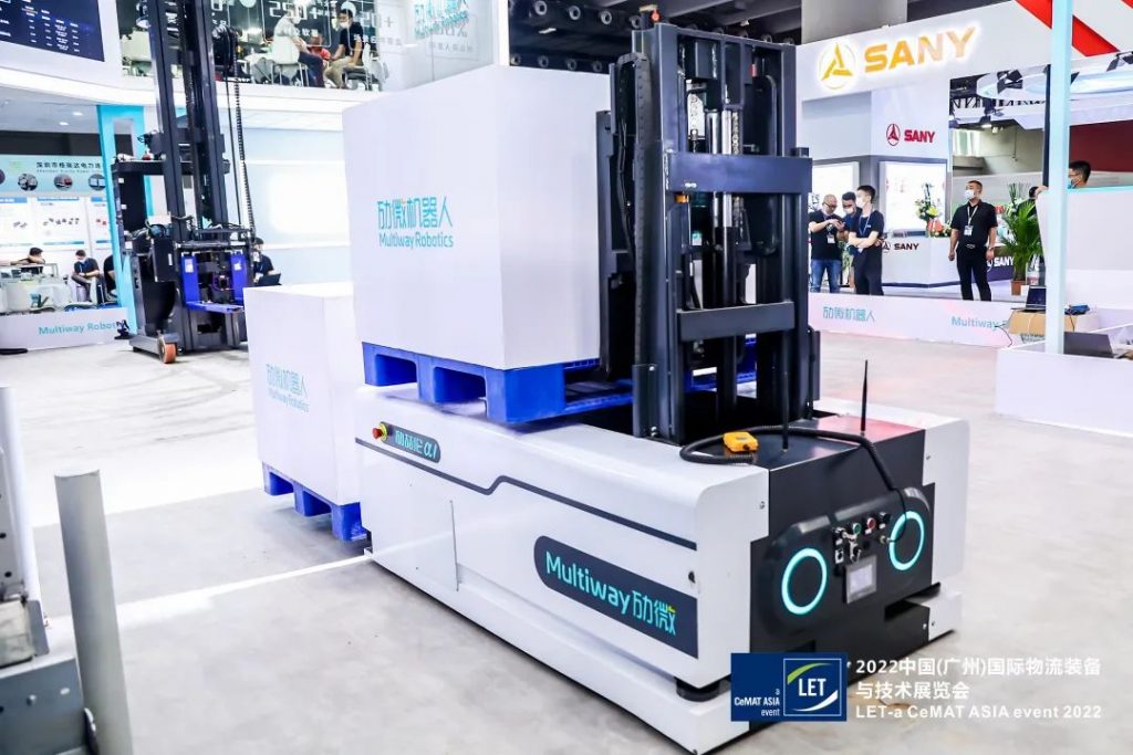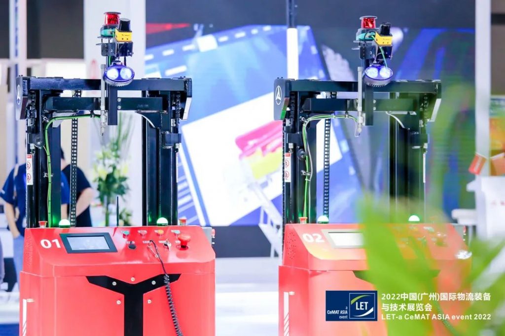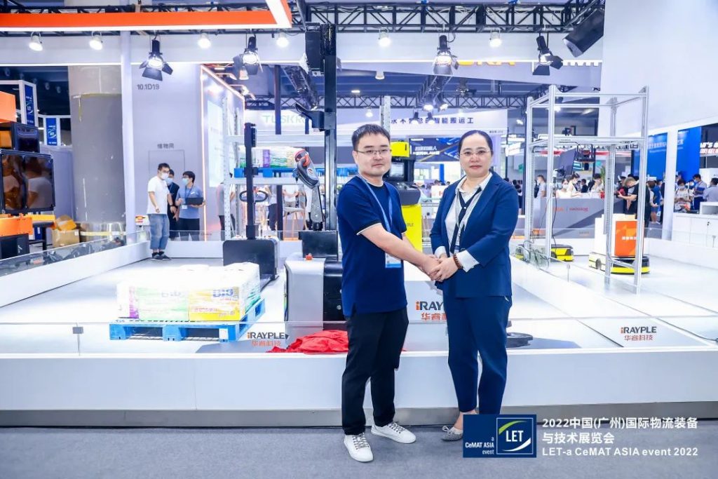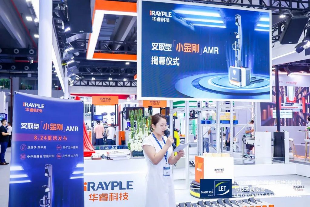 华睿科技带着全新的叉取型小金刚正式亮相LET2022。小型托盘搬运式叉取型AMR,可以满足托盘、笼车、货架等载具的地推搬运。广州市物流技术与应用协会秘书长、汉诺威米兰佰特展览(广州)有限公司董事总经理陈琳女士受邀出席新品揭幕仪式。