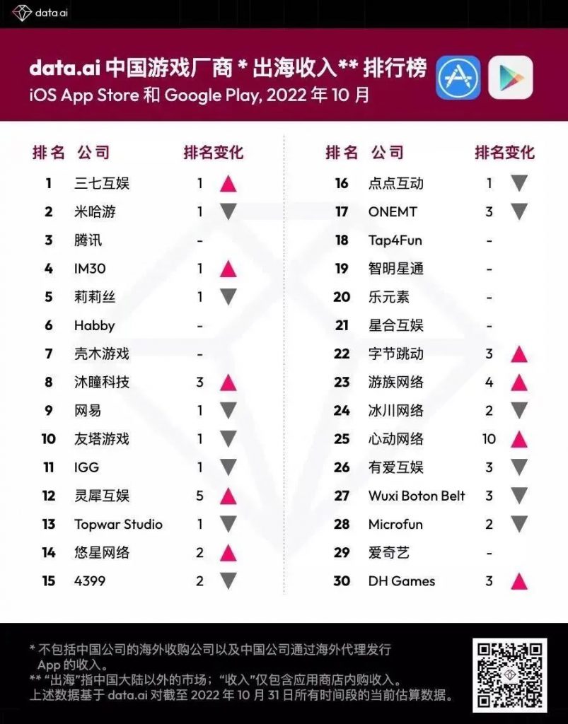 11月15日,第三方数据机构data.ai公布了中国游戏厂商及应用10月出海收入榜,其统计口径来自于iOS APP Store和Google Play两个平台。榜单显示,我会理事单位三七互娱首次超越腾讯、米哈游等游戏厂商,跃至10月中国游戏厂商出海收入排行榜榜首。