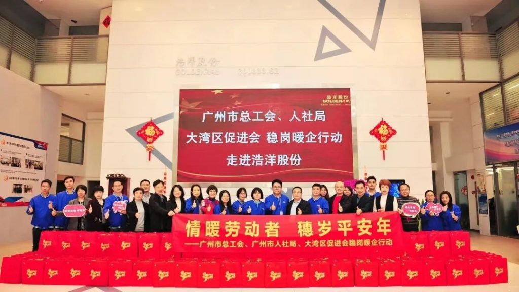 2月3日,广州市粤港澳大湾区经济文化促进会(以下简称“我会”)执行秘书长陈友军及秘书处工作人员在广州市总工会党组成员、副主席、女职委主任王玉琴的带领下前往我会理事单位广州市浩洋电子股份有限公司开展“情暖劳动者 穗岁平安年”稳岗暖企行动。广州市总工会一级调研员汤升林(市管干部),广州市浩洋电子股份有限公司工会主席李斌、党支部书记毛杰等参加活动。