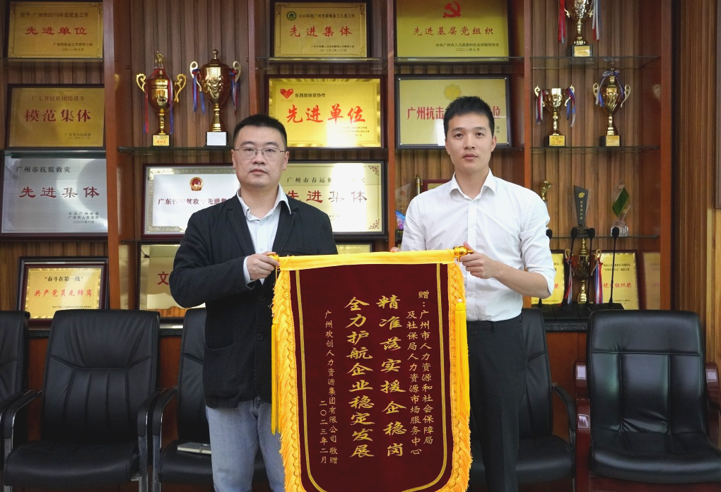 欢创集团总裁郭志鹏首先代表湾商会会员企业向市人社局人力资源市场服务中心及湾商会分别赠送锦旗,表达了对市人社局、湾商会联合组织开展“务工人员春节返穗专列行动”的感谢。