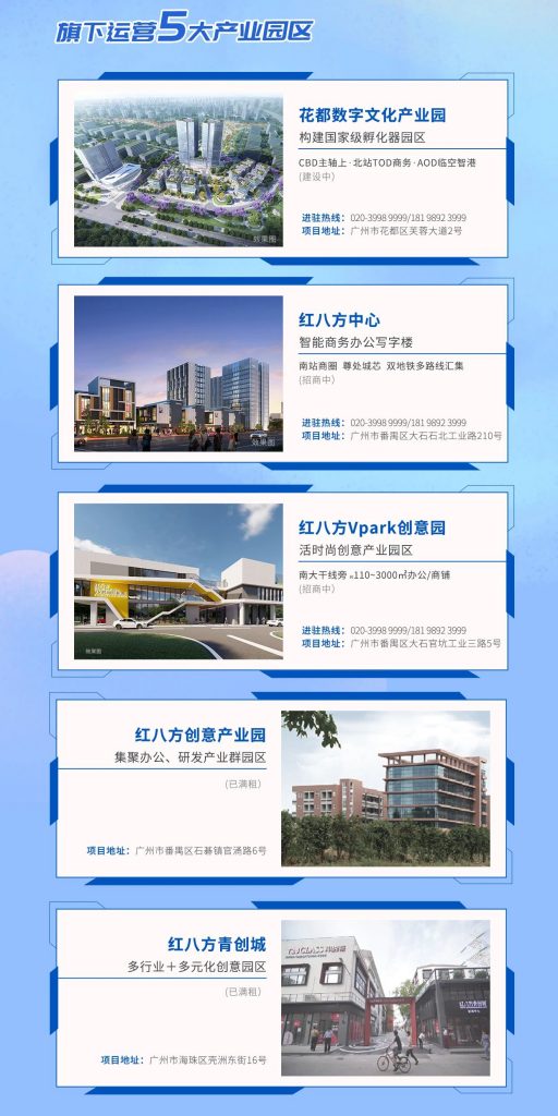 红八方地产以品质铸就价值,业务范围覆盖地产开发,产业运营、城市更新三大版块。地产开发(住宅地产、商业地产、产业地产)产业运营(总部经济及孵化器系列、活时尚创意系列、智造工业园系列)城市更新(海珠区石溪村及番禺区山西村城市更新改造项目)