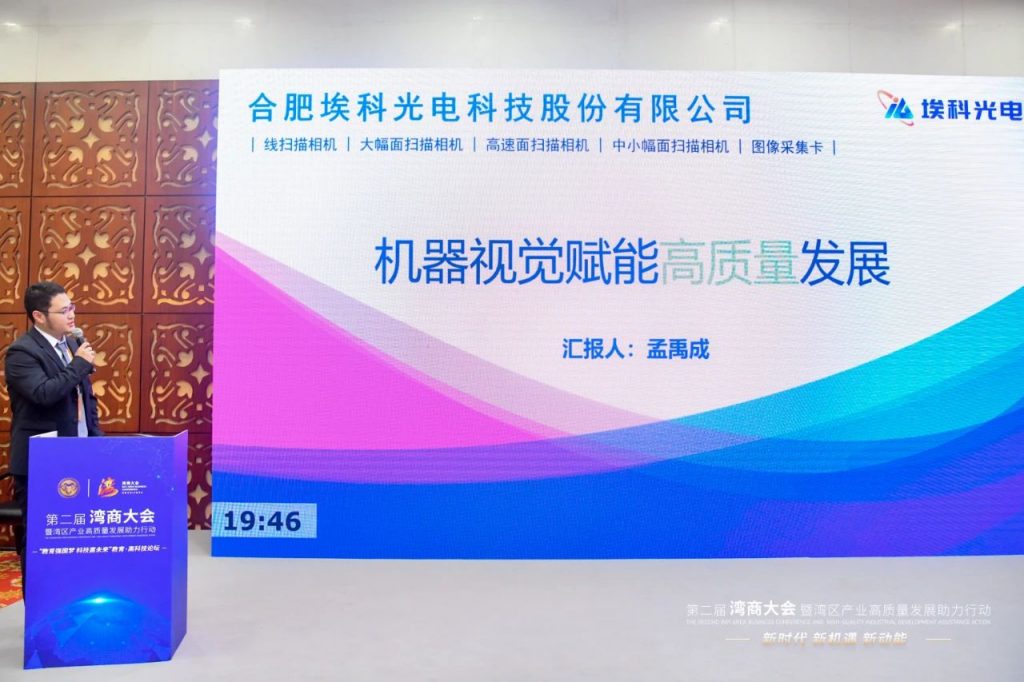 合肥埃科光电科技股份有限公司华南区总经理孟禹成作“机器视觉赋能高质量发展”主题分享。为参会观众普及机器视觉行业应用及产业升级与变化的知识,并介绍埃科光电产品线和未来研发方向。