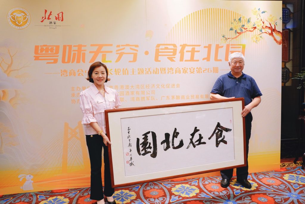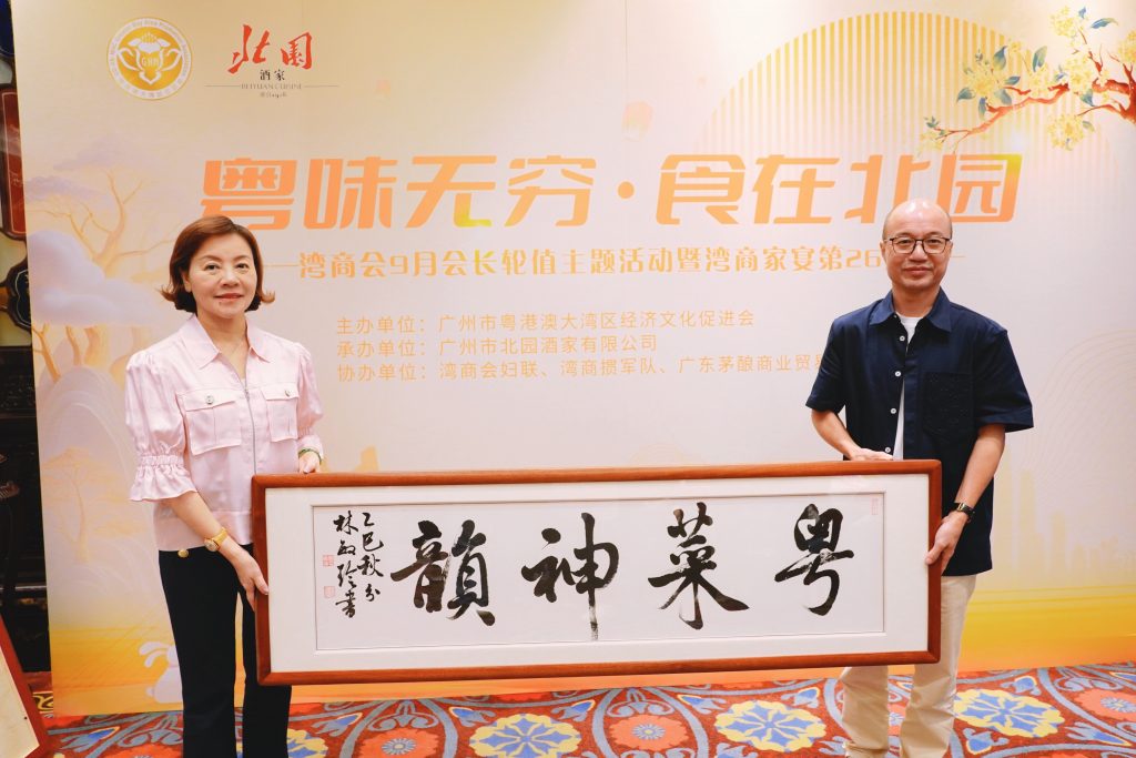 本次活动温情与雅韵交织。为肯定和感谢北园酒家对弘扬粤菜文化作出的卓越贡献以及李家励董事长对湾商会工作的鼎力支持,湾商会特别邀请了著名书法家、广东省文联原副主席乔平与知名书法家林敏玲亲题墨宝相赠,两幅作品不仅寓意深远,更是一份情谊的见证。