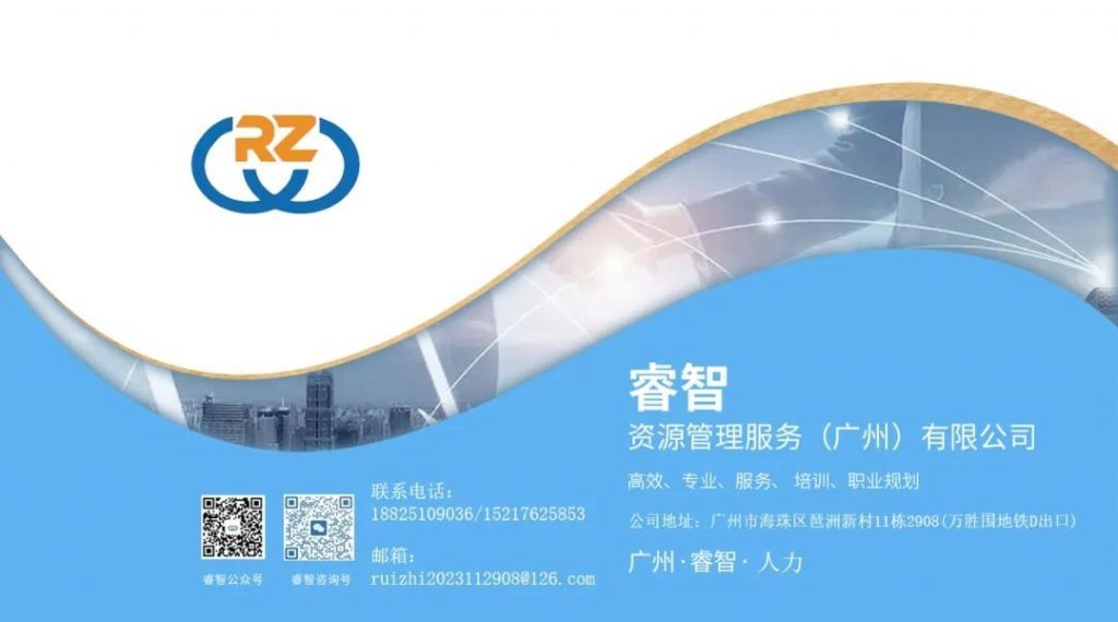 睿智资源管理服务(广州)有限公司(简称:广州睿智人力),是一家经广州市海珠区政府部门及人力资源和社会保障部门核准成立的正规、专业人力资源服务机构,具有人力资源和社会保障部门颁发的经营许可证;是一家以人力资源服务为导向,着力为政府机关、事业单位、大中型企业提供人才招聘、人才培训、技能提升、劳务外包、灵活用工等人才体系规划及培训为一体的人才服务运营商,专注为各行业提供定制化人才培养输出,为广大行业提供高效、专业、服务、培训、职业规划等一体的生态链服务。