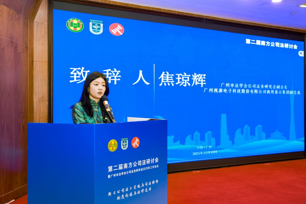 闭幕式上,湾商会副会长单位视源股份代表焦琼辉女士致辞。她表示,本次研讨会聚焦新公司法实施中的重大疑难问题,为各方搭建了高水平的专业交流平台,与会者不仅深化了对法律条文的认知,更凝聚了推动法治落地的行动共识。