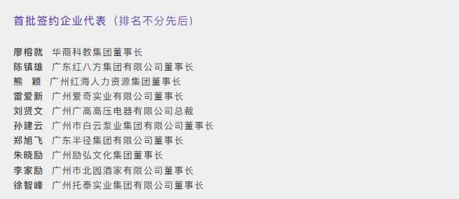 在企业合作层面,华商科教集团、红海人力资源集团、红八方集团、广高高压电器、白云泵业集团、广东半径集团、励弘文化集团、北园酒家、托泰实业集团、爱奇体育十家大湾区知名企业率先签约支持。