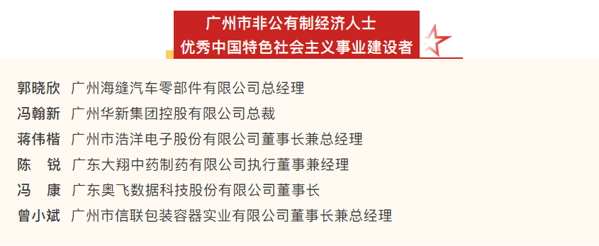 大会授予湾商会副会长郭晓欣,副会长单位广东奥飞数据科技股份有限公司董事长冯康,理事冯翰新、蒋伟楷,常务副会长单位大翔医药集团广东大翔中药制药有限公司执行董事兼经理陈锐,理事单位广州市信联包装容器实业有限公司董事长兼总经理曾小斌等60人“广州市非公有制经济人士优秀中国特色社会主义事业建设者”称号,授予湾商会常务副会长单位广州市白云泵业集团有限公司,副会长单位唯品会(中国)有限公司等20家企业“广州市光彩事业贡献奖”。
