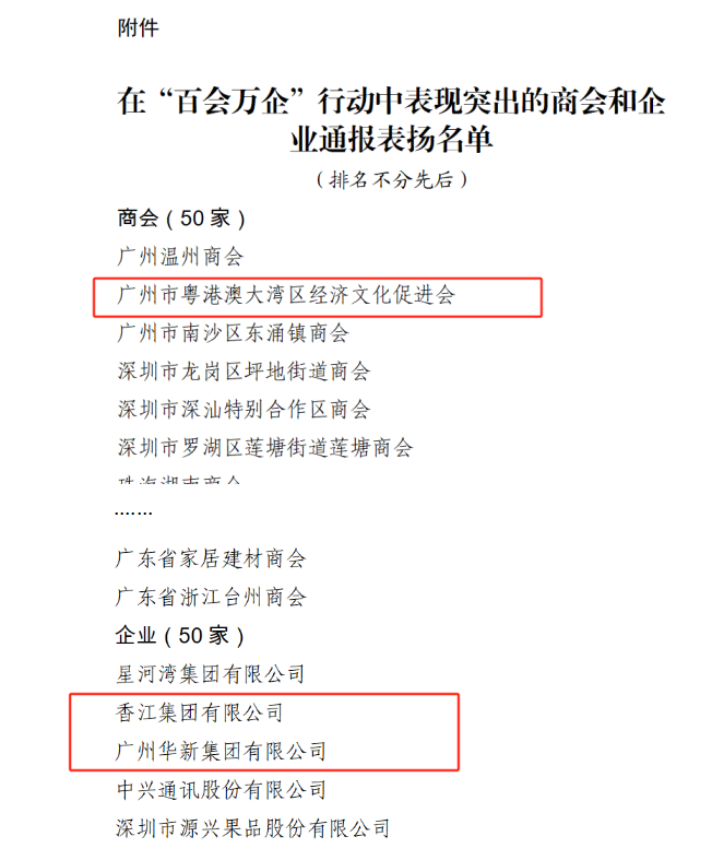 湾商会荣获省工商联“百会万企”行动“表现突出商会”称号,名誉主席单位香江集团、名誉会长单位华新集团获评“表现突出企业”。