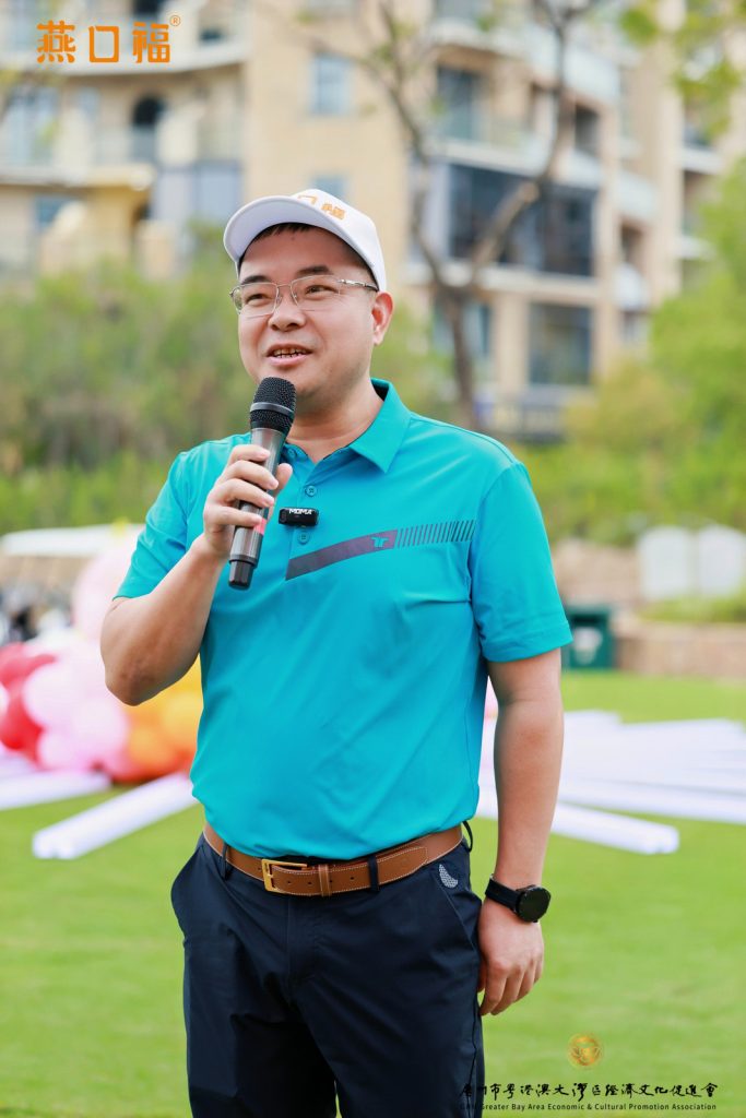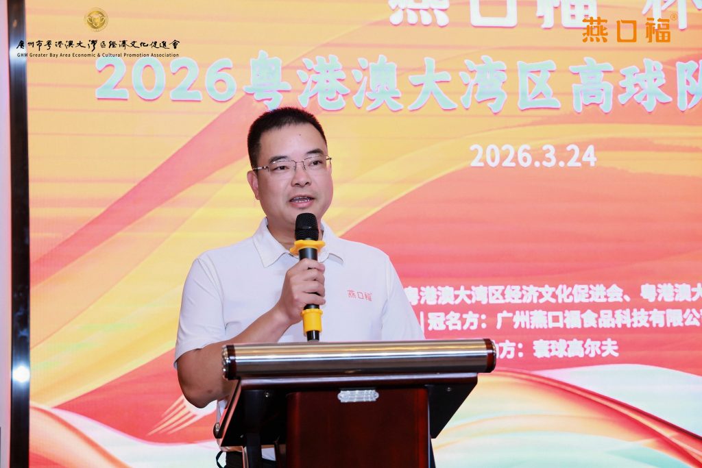 赛事承办方及冠名赞助方、广州燕口福食品科技有限公司董事长陈松辉致辞。他表示,粤港澳大湾区高球队是以球会友、强健体魄、凝心聚力的交流平台,其精神内核将湾区企业家紧紧相连。祝愿大家尽情挥杆,赛出辉煌。