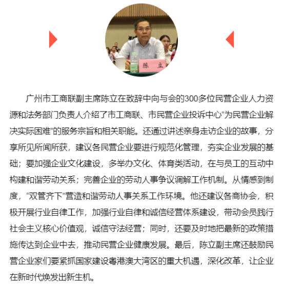 9月13日,由广州市工商联、广州市劳动人事争议仲裁院联合主办,广州市民营企业投诉中心、天河区工商联、白云区工商联、市民营企业商会、粤港澳大湾区经济文化促进会等单位承办的“2018年广州市预防劳动人事争议业务培训”在白云国际会议中心成功举办。我会主管单位广州市工商联副主席陈立,广州市劳动人事争议仲裁院院长马丽娜等应邀出席活动并致辞。