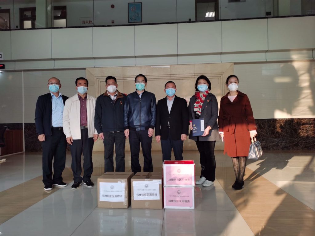 2月21日下午,广州市粤港澳大湾区经济文化促进会(以下简称“促进会”)监事长陈镇雄、秘书长李晓岚代表促进会为广州市番禺区洛浦街道一线基层工作人员送去800只一次性医用口罩、800只医用手套、8瓶5L装酒精消毒液,支持基层疫情防控工作。洛浦街道党工委书记曾远明、党工委副书记李艺妍代表洛浦街道接收了这批物资,市工商联陈立副主席、番禺区工商联岑镜洪副书记到场见证。
