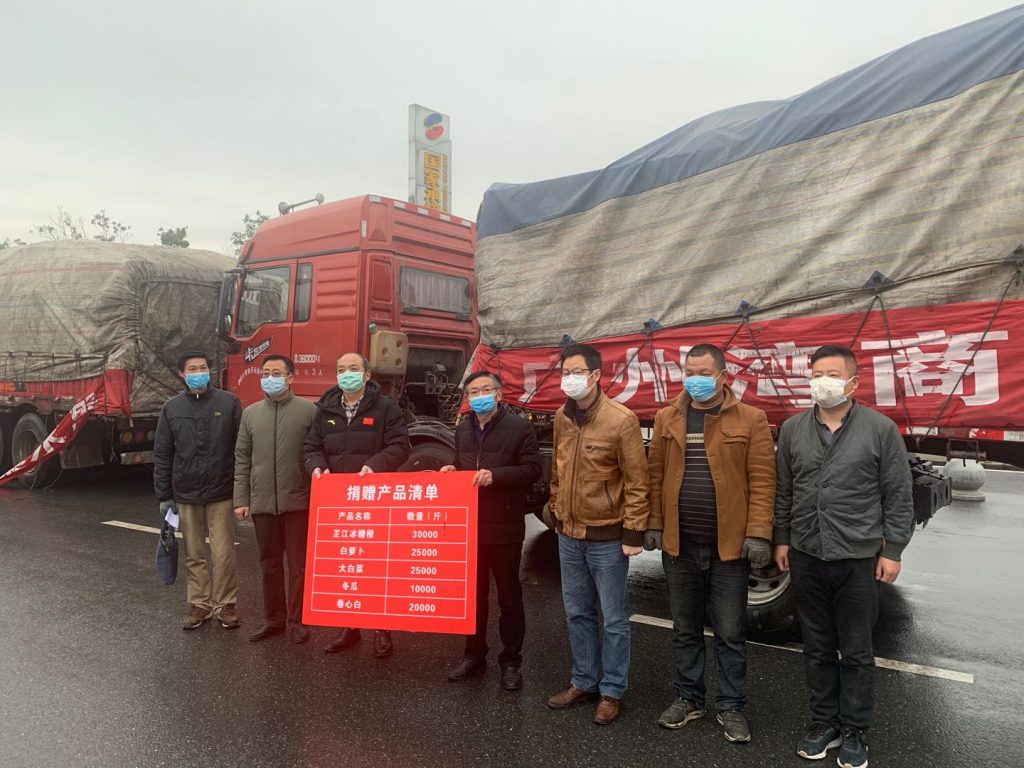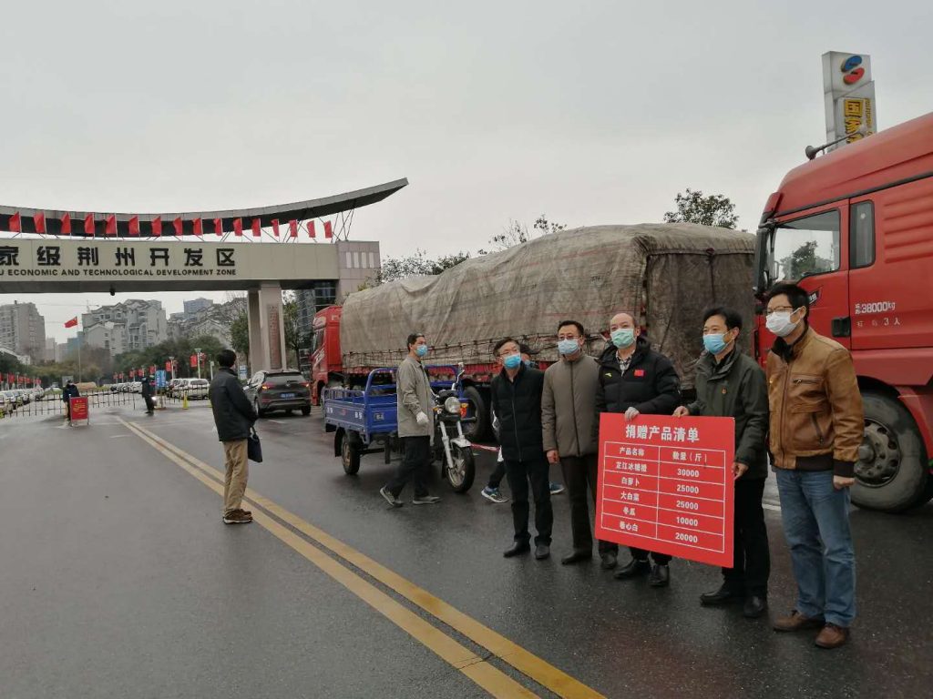 按中央部暑,广东对口支援湖北荆州。新冠肺炎疫情发生以来,荆州当地医疗机构及援荆医疗队的医务人员积极投身疫情防控工作中,但条件十分艰苦,很多时候只能吃方便面等速食充饥。同时由于全城实行严格封闭管理,市民生活物资也非常缺乏。促进会领导层了解到荆州生活物资存在缺口的情况后,立即安排采购一批生活物资,包括芷江冰糖橙30000斤、白萝卜25000斤、大白菜25000斤、冬瓜10000斤、卷心白20000斤,共计55吨,希望这批新鲜蔬菜水果能改善一线抗疫“战士”及市民的生活条件。