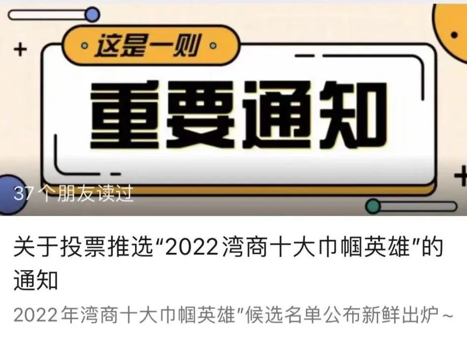 本月举办的“2022湾商十大巾帼英雄”,经筛选,共19名杰出女企业家进入网上投票环节。目前网上投票环节正如火如荼进行中,欢迎各界人士点击下列链接投上您重要的一票。同时启动了“2022湾商十大青年领袖”及“2022十大湾商新生代”推选活动,请大家关注并转发相关信息。