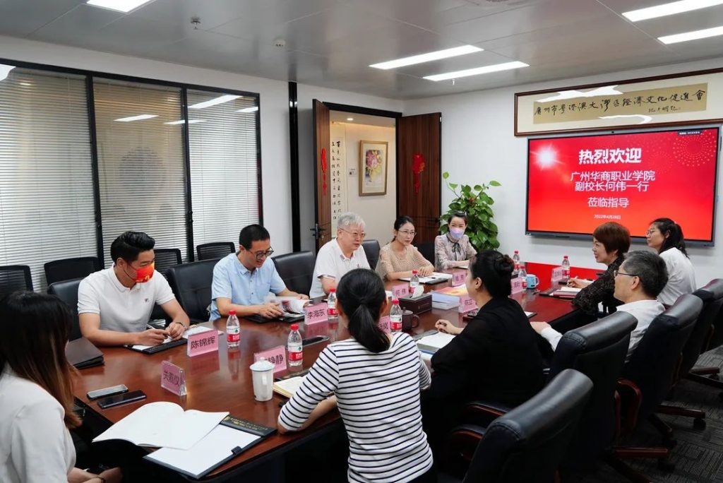 2022年4月28日,粤港澳大湾区经济文化促进会会长单位广州华商职业学院副校长何伟携校企联合办主任钱芳、继续教育处副处长李海东,以及招生就业处、国际教育学院等相关处室负责人到访促进会,与促进会副会长兼秘书长李晓岚、副秘书长高阳等就华商职业学院与促进会的友好合作进行会谈。市工商联二级巡视员陈立应邀出席会谈。