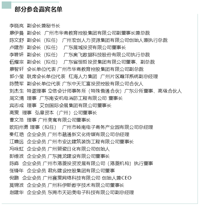 促进会副会长、广州市华商教育控股集团有限公司副董事长兼总裁廖伊曼,促进会副会长(拟任)、欢创集团创始人兼执行总裁陈文舒,促进会副会长(拟任)、广东奥飞数据科技股份有限公司执行总裁李碧妍,促进会副会长(拟任)、广东展域投资有限公司董事长卢建彤,促进会副会长(拟任)、广东省恒哲投资集团有限公司董事长伍耀宗,促进会副会长(拟任)等40余位会员单位企业家及高管出席,促进会副会长兼秘书长李晓岚主持本次活动。